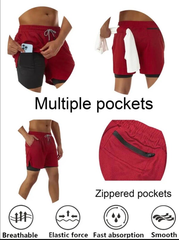 3pcs Mens Summer Sport Shorts- lightweight, stretchy jersey fabric material, breathable, zipper pockets, ideal for runing, beach days, and gym training.